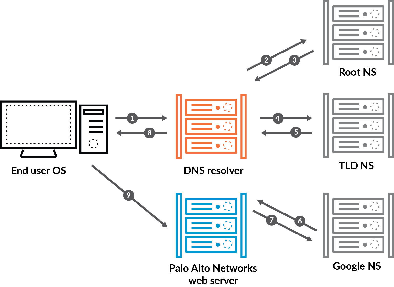 - You, the user, initiate a query by typing www.paloaltonetworks.com into your browser. The query is sent to a DNS resolver, a computer usually provided by an IP provider. It is the DNS resolver’s job is to track down the IP address.