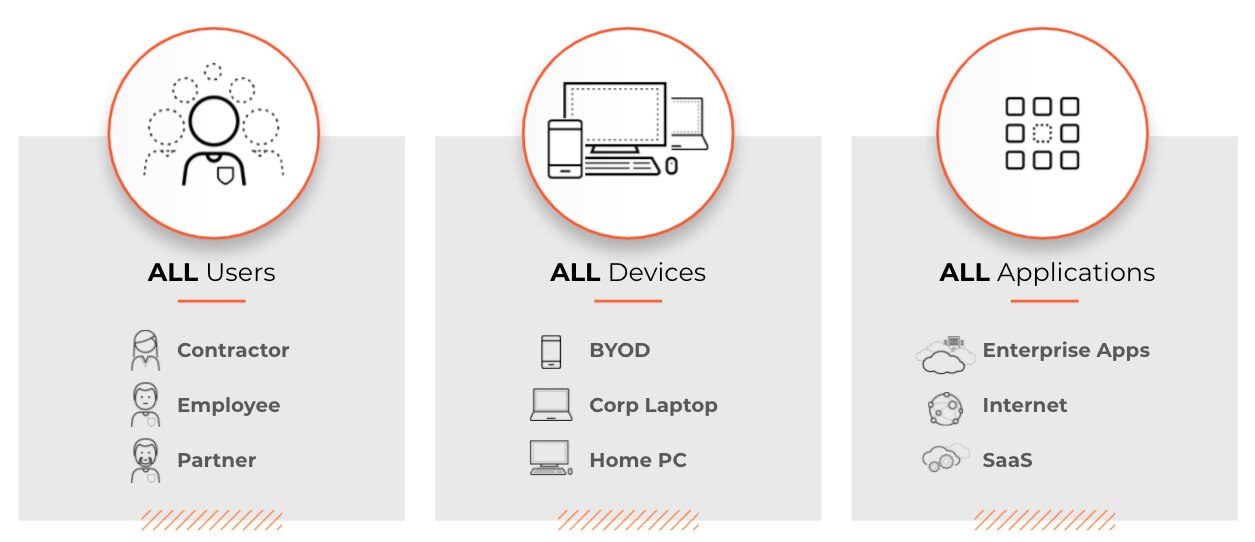 To accomplish Zero Trust Network Security, the access and security core capabilities described above must be available everywhere users and devices live and work. Access and security must be consistent. The location of the user, device or application should not matter. This will allow all users to use any device to securely access any application they need to perform their job. This can safeguard productivity and be a powerful business enabler.
