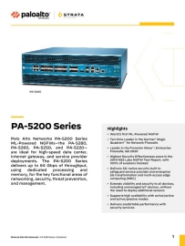 Palo Alto Networks PA-5200 Series ML-Powered NGFWs—the PA-5280, PA-5260, PA-5250, and PA-5220— are ideal for high-speed data center, internet gateway, and service provider deployments. The PA-5200 Series delivers up to 64 Gbps of throughput, using dedicated processing and memory, for the key functional areas of networking, security, threat prevention, and management.