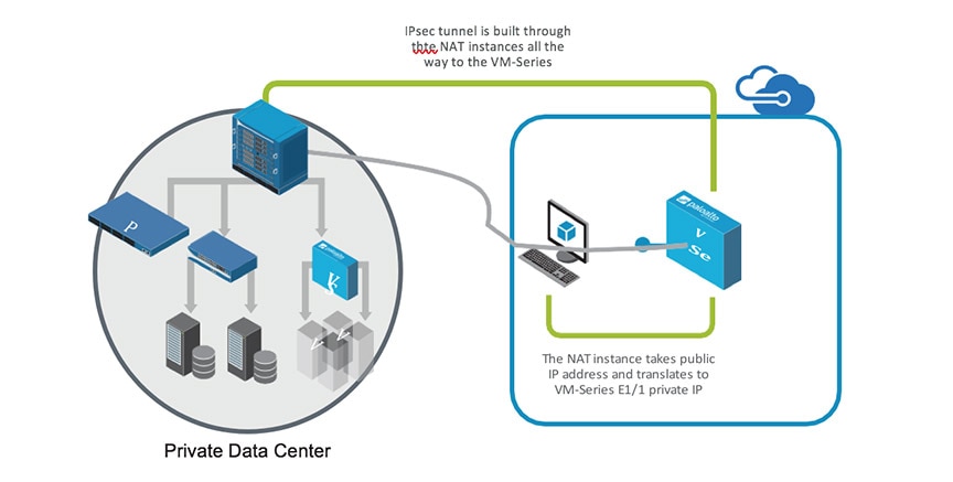 In the case of the NAT instance, we require a worker node, or basic Linux® instance that takes all traffic on its primary instance and NATs it to the secondary (E1/1) interface of the VM-Series. An IPsec tunnel would then be setup to terminate through the NAT instance terminating on the VM-Series itself, as shown in image 4.